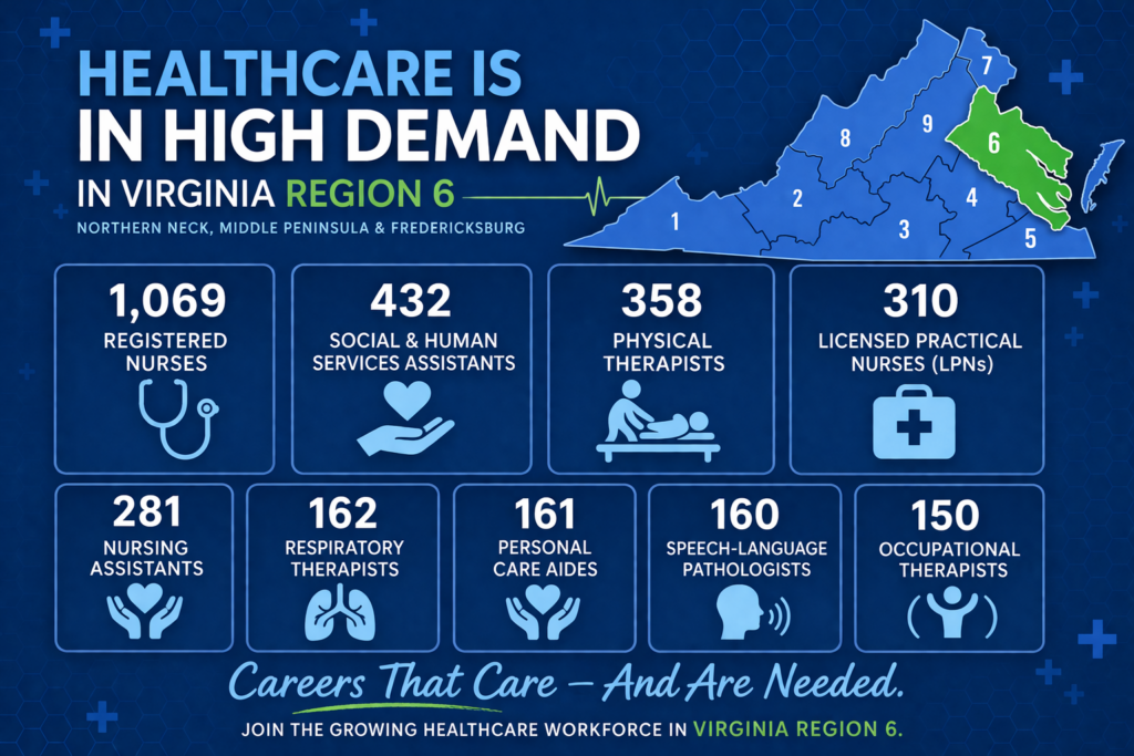 Want to learn more about healthcare careers? Check out our TikTok Page. Think of it as your behind-the-scenes pass into the world of healthcare in Virginia—where scrubs, stethoscopes, and real stories come to life. From day-in-the-life clips of healthcare professionals to quick career tips, training pathways, and spotlight features on in-demand jobs, every video gives you a glimpse into what it’s really like to work in the field.